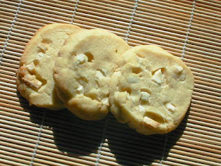 La dernière plaque, j'ai carrément attendu le lendemain soit presque 24 h après avoir fait la pâte, pour la faire cuire. Résultat: les biscuits n'ont pas explosé... ils n'ont pas fait de socle non plus: juste un petit dôme blanc, point.